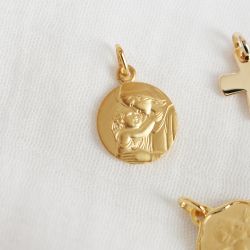 Cette médaille Vierge à l’Enfant en plaqué or représente la Vierge Marie portant l’Enfant Jésus, symbole intemporel d’amour et de protection.